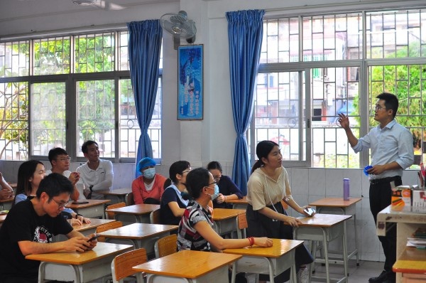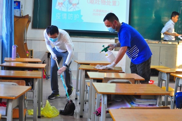 下午4点50分,模拟演练开始。上课期间,二甲班一名“学生”头晕胸闷想呕吐,报告上课老师。上课老师立即戴好口罩,提供呕吐袋给学生并打电话报告领导小组成员。班长迅速疏散学生到户外,领导小组成员接到通知,启动应急预案,组织应急小组成员前来支援处置。卫生保健组老师对全班学生进行体温复测,引导呕吐学生到隔离点观察,消毒组老师立即使用专用消毒桶、扫把、抹布等,配置消毒液,对现场进行消毒,并对呕吐物进行杀菌消毒。演练过程迅速、有序,分工明确,在最短时间内完成突发事件应对与处理。