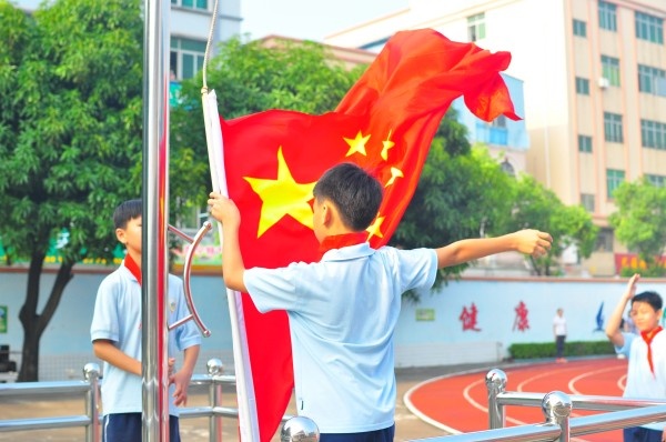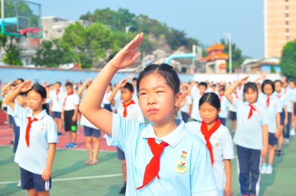 庄严的升旗仪式在优秀的小主持人的指示下顺利开始了!伴随着激昂有力的出旗乐曲,升旗手和护旗手,踏着有力而坚定的步伐,护送着国旗走向升旗台。嘹亮的国歌声响起,全体少先队员齐敬队礼,注视着五星红旗冉冉升起。新一代少年在象征祖国的国旗下迎来新的学期,怀抱新的憧憬和希望。
