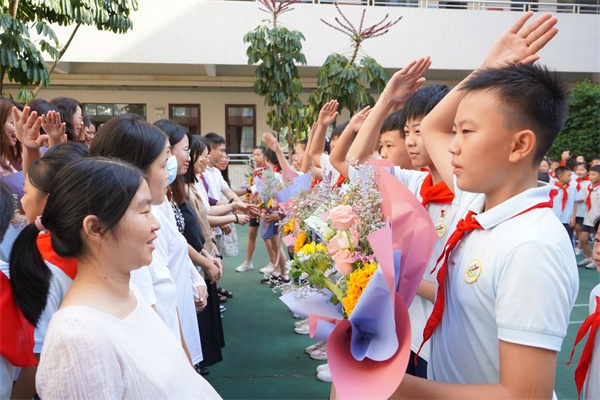 音乐响起,六年级学生代表为老师们献上鲜花,致以节日的问候。一束束鲜花与一句句真诚的感谢表达了孩子们对所有辛勤耕耘的老师们最崇高的敬意。