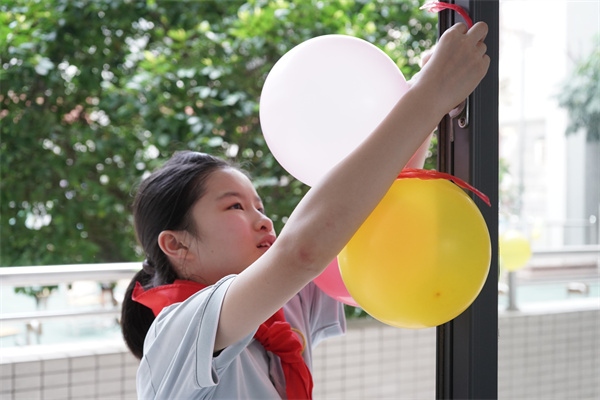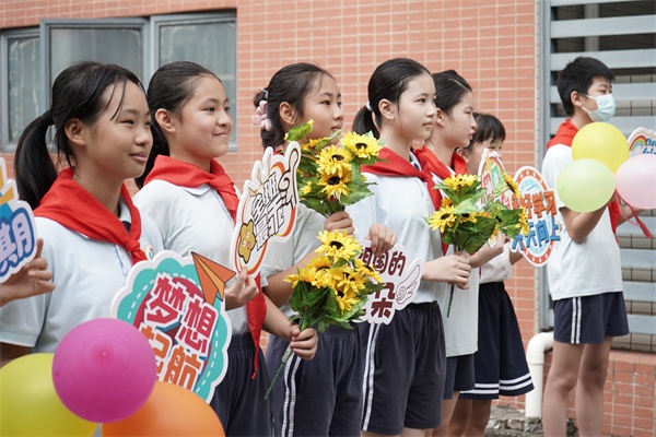 沐浴着秋日的朝阳,高年级的哥哥姐姐们也早早到校,搬桌椅、挂气球、布置会场、列队欢迎……为新生们的到来做足准备。