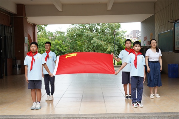 雄壮有力的出旗曲中,党旗缓缓入场。全体同学肃立,向迎风飘扬的党旗敬礼,一颗颗跃动的心焕发着激动和喜悦,表达着对党由衷的热爱。少先队大队辅导员罗锦老师带领全体队员一起回顾了中国共产党101周年的宏伟业绩和香港回归25周年的不平凡历程,号召队员们紧握红色接力棒,在星星火炬的照耀下,听党话、跟党走,用实际行动迎接党的二十大胜利召开。