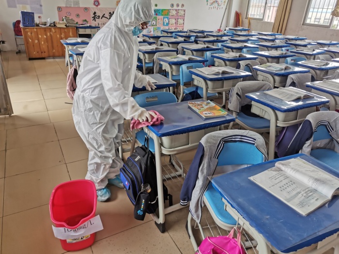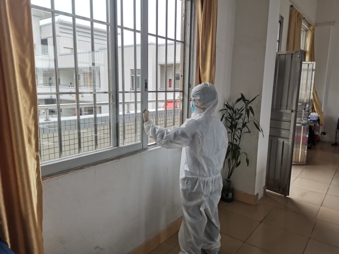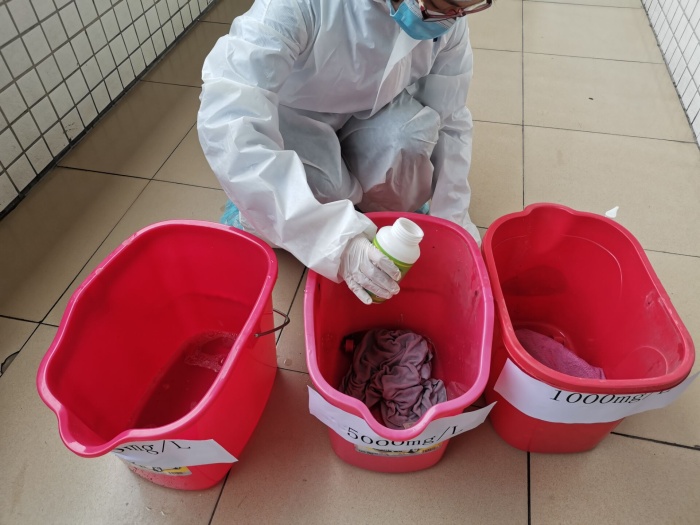 本次演练以如何处置呕吐物为主,班主任和学生代表、吴医生在谭主任的组织下,有序地进行个人防护用品的穿戴,包括佩戴口罩、穿好隔离衣、戴好一次性手套和帽子等,随后将清洁吸附巾覆盖在呕吐物等污物上,接着将污浊吸附巾放入原包装袋密封丢入废物袋中,再取出湿巾由干净区到污浊区从外至里螺旋式擦拭,至中心区域后收紧湿巾丢入废物袋,消毒完成后,依次脱去防护用具。