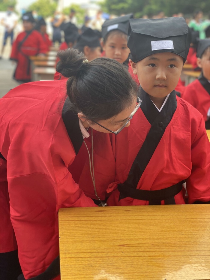 在悦耳的音乐声中,同学们跨进智慧门,“正衣冠”、“朱砂启智”、“击鼓鸣志”、“启蒙描红”……感受学习的乐趣、养成良好的学习习惯。