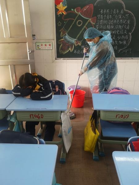 课室是学生主要的活动场所,演练第二阶段,模拟任课教师上课期间,在教室里发现一学生萎靡不振,咳嗽,浑身发冷并伴有流感样症状,马上安排孩子与其他学生保持安全距离。将学生带到校内隔离点,并通知相关负责领导。同时,班主任重点对教室进行消杀。
