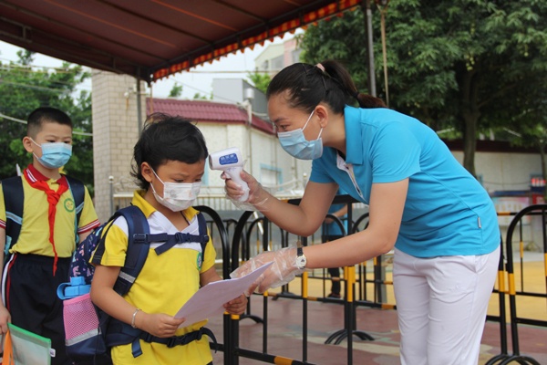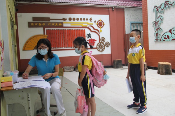 为了迎接低年级同学的开学,学校做了各种精心的准备,每一个细节都蕴藏着贴心的守护。早上7点未到,学校全体行政、值日教师、保安、驻校校医等各司其职,在不同岗位迎候返校同学们的健康归来。校园体温检测通道准时开启,7:10同学们按照学校报到要求,陆续错峰返校。他们佩戴口罩,根据地面标示线,有序间隔一米距离排队,进入规定通道接受测温,迎来了新学期第一天校园生活。
