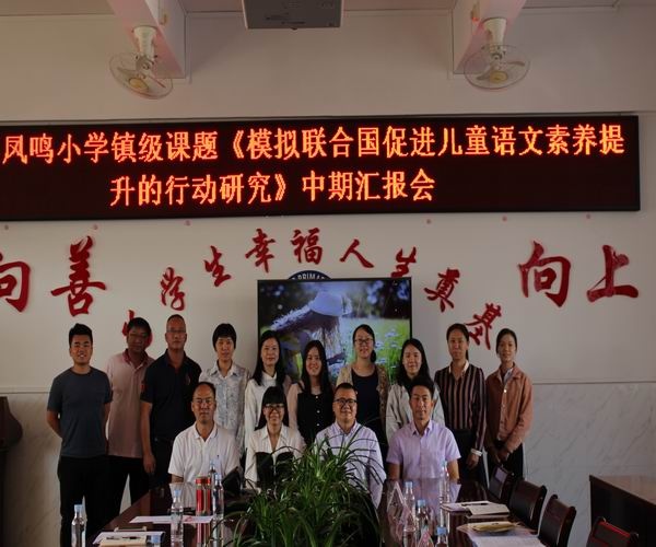 11月12日,凤鸣小学举行镇级课题《模拟联合国促进儿童语文素养提升的行动研究》中期汇报会,东凤镇课题专家组的林红主任、陈名胜主任、何中建主任、陈簿新主任,凤鸣小学吴桂凤副主任以及课题组全体成员参加本次会议。