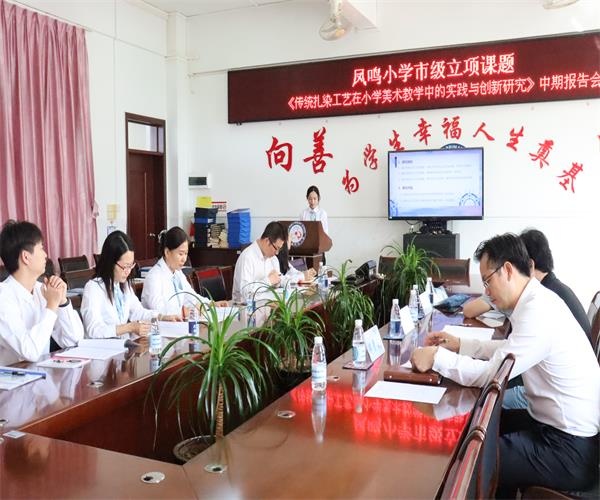 12月7日上午,东凤镇凤鸣小学举行了中山市教育科研2020年度青年课题《传统扎染工艺在小学美术教学中的实践与创新研究》课题研究的中期汇报会。本次会议邀请了中山市教育教学研究室美术教研员沈文老师、东凤镇教育和体育事务中心艺术专干邹营发老师、东凤镇教育和体育事务中心陈林方老师莅临指导,刘松校长、庄惠茜副校长以及课题组全体成员参会。
