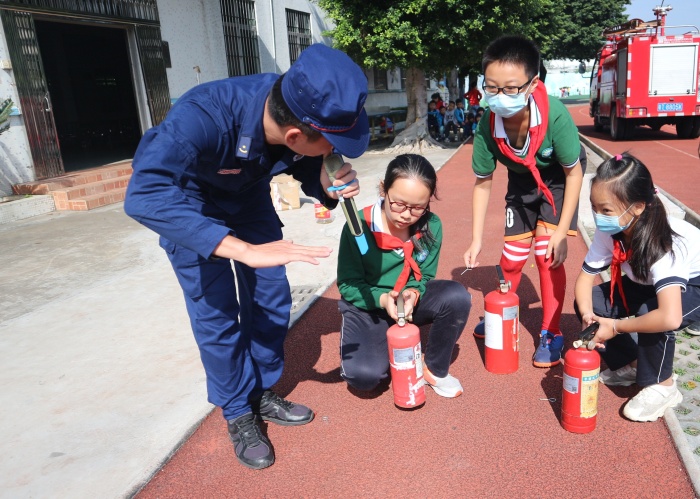 随后,东凤镇消防大队指导员给全校师生讲解了生活中煤气、家用电器插座的安全使用以及注意事项等常见安全隐患及防范措施。接着给全校师生讲解干粉灭火器的使用方法,以及如何利用灭火器扑灭初起火灾。教师和学生代表也利用灭火器进行了实战灭火。