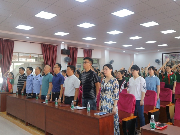 本次活动共四个环节。首先,阮丽霞主任主持会议,带领全校师生举行简单而不失庄重的升旗仪式;接下来由法制副校长卢日文警官做假期安全专题讲话,卢警官借用广告语“道路千万条,安全第一条”,着重强调了假期“人身安全、居家安全、出行安全”的重要性,强调把安全变成习惯,铸就平安愉快的假期。