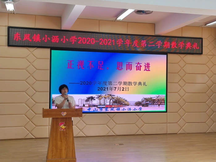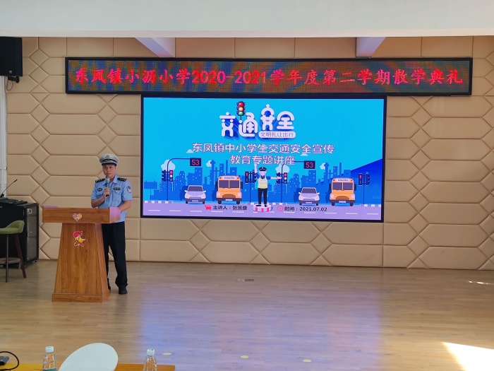 散学典礼由小沥小学陈名胜主任主持,共有四个议程,分别是法制安全教育、交通安全教育、小沥小学黎三妹副校长作学校工作总结以及师生颁奖仪式。首先由小沥小学法制副校长梁凎荣警官为全体师生作了非常详尽的暑假法制安全教育。梁警官从疫情防控、防溺水、用电安全、防诈骗等方面展开教育,重点强调暑假防疫,非必要不离粤不离市,确保安全健康返校。接着由东凤镇交通安全宣讲员张景康警官为师生们作了交通安全教育。张警官从行走安全、乘车安全、骑车安全等方面提醒师生遵守交通法规,注意人身安全。