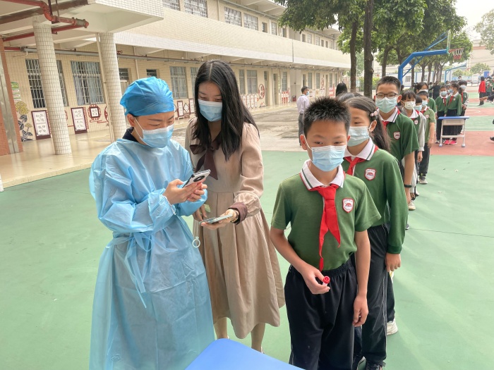 当天上午9点,医务人员到达学校后,检测有条不紊地开始了。调度的调度,测温的测温,扫码的扫码,引导的引导,检测的检测,所有人员密切配合,学生们间隔1米,在老师们的清晰指引下,按照班别、小组依次进行核酸检测,整个过程井然有序。