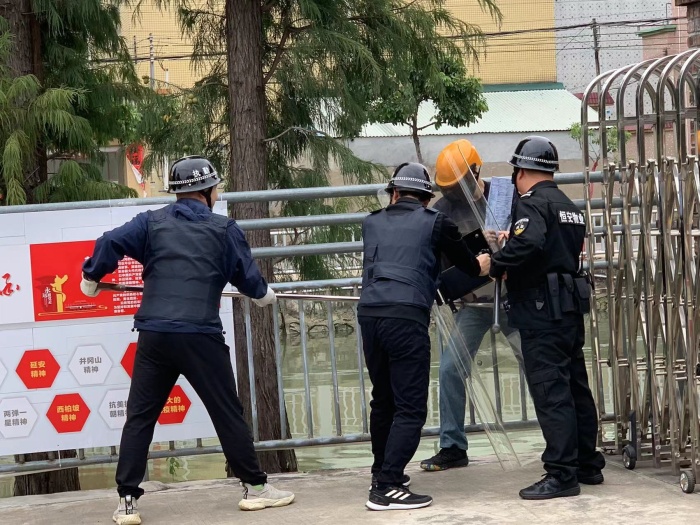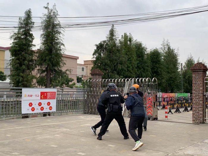随后防恐防暴演练部分正式开始,有一名“恐怖分子”潜入了校园,保安迅速将其拦住并拉响警报信号,并立即通过校园广播发出信号“发现有可疑恐怖分子进入校园,各位老师立即组织学生回教室躲避”。师生们闻讯迅速回到教室,将教室门、窗户关紧上锁。应急防暴组紧急出动,手持防爆叉等工具将“恐怖分子”团团围住,竭力保护学生安全。学校保安、护校组齐心协力,与“恐怖分子”展开搏斗,最终将其制服。