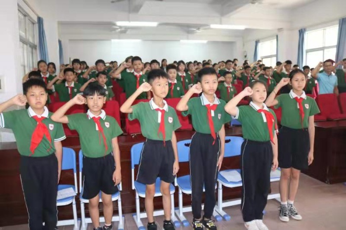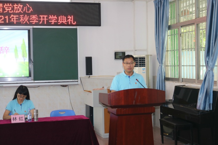 接着,中山市优秀班主任钟亮老师作为教师代表激情演讲,他表达了自己将继续全心全意为学生服务,恪守师德,不负韶华的决心。随后学生代表李妍姗发言。虽然语言稚嫩,但“树立远大目标,不负青春,做好时代接班人”的理想却一览无余。然后,学校法制副校长卢日江以“安全无忧,快乐成长”为主题给大家上了一堂生动的安全法制课。最后同学们庄严宣誓,“请党放心 强国有我”,洪亮的声音响彻校园。