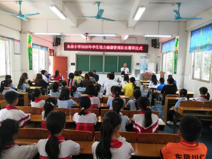 为普及科学用眼知识,增强学生的爱眼、护眼意识,10月10日上午,东凤镇永益小学在阶梯室举行了“2020年学生视力健康管理队伍履职仪式”。永益小学蒋汉云校长、全体班主任、各班学生及家长代表参加了本次活动。