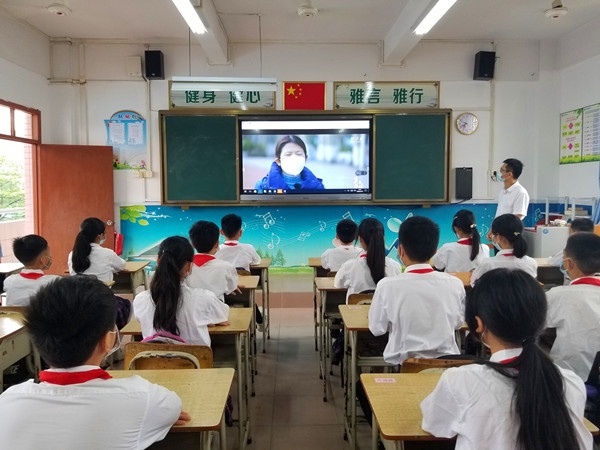 8点40分,由于天气的原因,升旗仪式在课室进行。同学们戴好红领巾,在课室庄严肃立,面对着冉冉升起的五星红旗,歌唱着雄壮的国歌,胸中感怀着对祖国的感恩与自豪,迎接复学后的第一次升旗仪式和复学典礼。