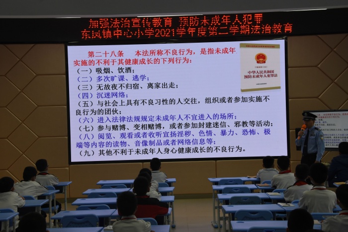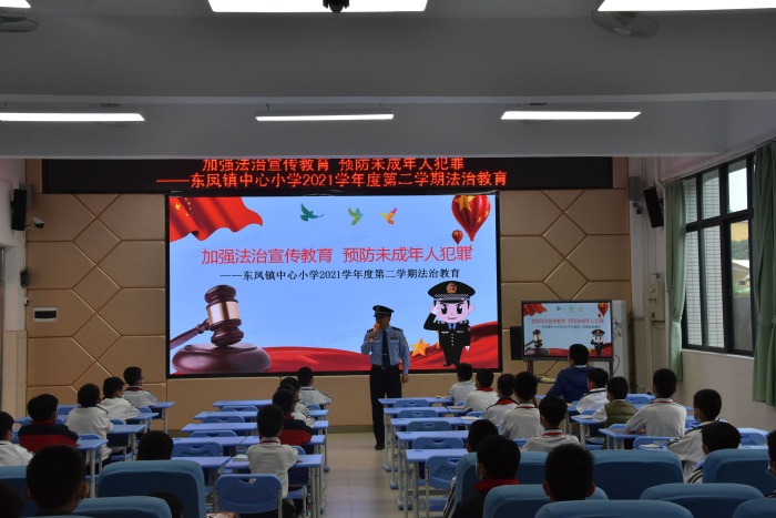 为进一步增强学生的守法和自护意识,4月19日下午,东凤镇中心小学开展了“加强法治宣传教育 预防未成年人犯罪”法治教育活动,该活动邀请了学校法治副校长伦礼科以及法治辅导员陈钊和警官为同学们作讲座。