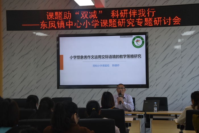 活动分为二大环节。第一环节是东凤镇中心小学语文科组的4项立课题和民和小学语文科组的立项课题进行课题研究交流分享,经过交流,大家一致认为课题研究要注重“学”,坚持“写”,突出“新”,追求“实”。