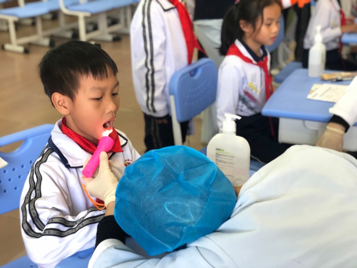随后,同学们有序排队让医生逐一检查牙齿,医生根据检查给出了专业的指导意见。