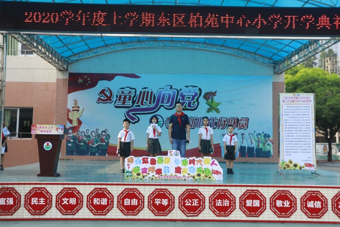 为勉励广大少年儿童牢记习近平总书记的教导,以习近平新时代中国特色社会主义思想为指导,传承红色基因,践行社会主义核心价值观,学习身边的榜样,做新时代的好少年,为实现中华民族伟大复兴的中国梦而努力奋斗,助力全市奋勇夺取全国文明城市“六连冠”,共同创造更美好的生活。2020年9月1日上午,东区柏苑中心小学举行了以“传承红色基因,争做时代新人”为主题的开学典礼。