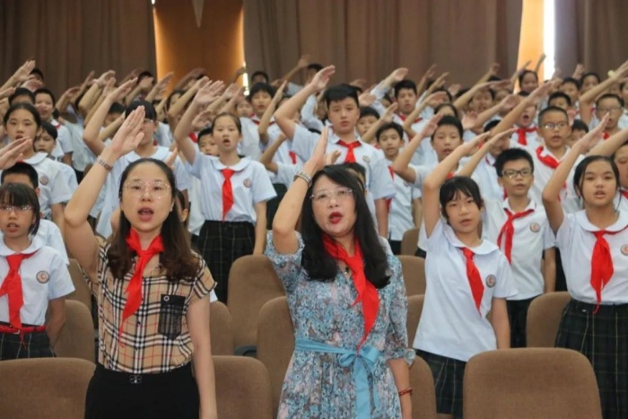 第二部分为一至五年级大队开展“礼赞中国”庆国庆活动,队员们和准队员们通过“革命歌曲赞祖国、诗歌诵祖国”等环节,了解祖国历史,唱出对祖国的热爱,诵出作为中国人的自豪。