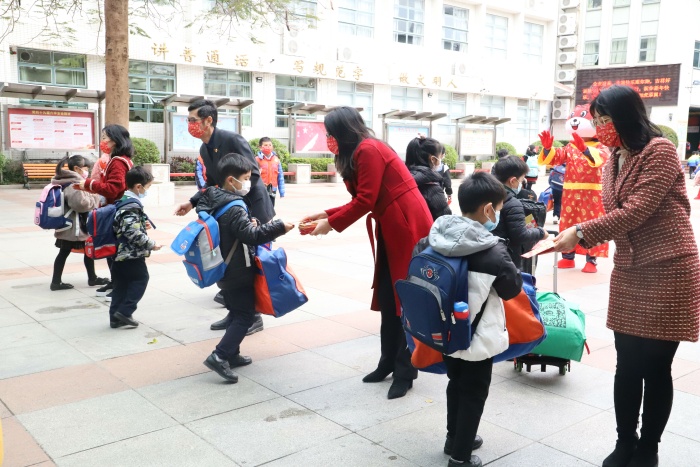 2月14日上午,东区水云轩小学到处充满欢声笑语。笑容可亲的值日老师,和蔼可敬的行政团队站在校门口迎接轩小学子。他们给孩子们派发新年利是,一封封红彤彤的利是在他们手中传递着,暖意浓浓。小小的利是里面是老师们精心准备的新春祝福书签,上面画有“冰墩墩”和“雪融融”,寄托着老师对学生的殷殷期盼,期待“一起向未来”。广场上更有四名老师化身“四小虎”与学生热情互动,给学生送上衷心的祝福。