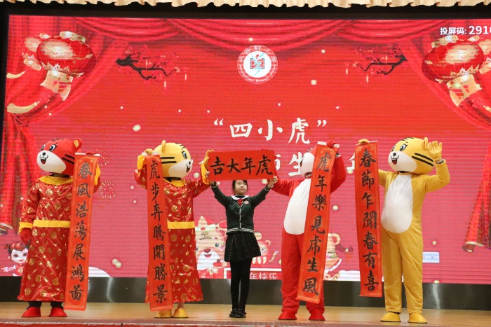 全体师生参加2022年春季开学典礼。典礼开始,台上率先走来了“吉祥虎”、“平安虎”、“健康虎”、“鸿运虎”,“四小虎”给大家送来新学期的祝福。