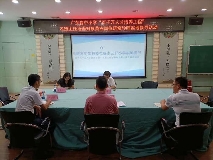 座谈会由水云轩小学副校长黄文灿主持。座谈会伊始,林小舟校长代表学校对罗明星导师、区领导的莅临指导表示热烈欢迎和衷心感谢,对莫杰老师入选为广东省中小学“百千万人才培养工程”小学名班主任培养对象表示热烈祝贺,并向罗教授介绍了水云轩小学教育教学基本情况以及班主任队伍建设的政策支持与做法。