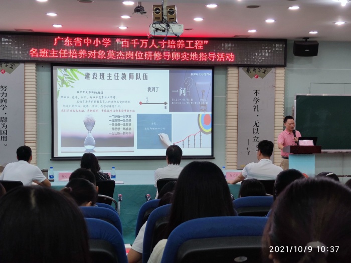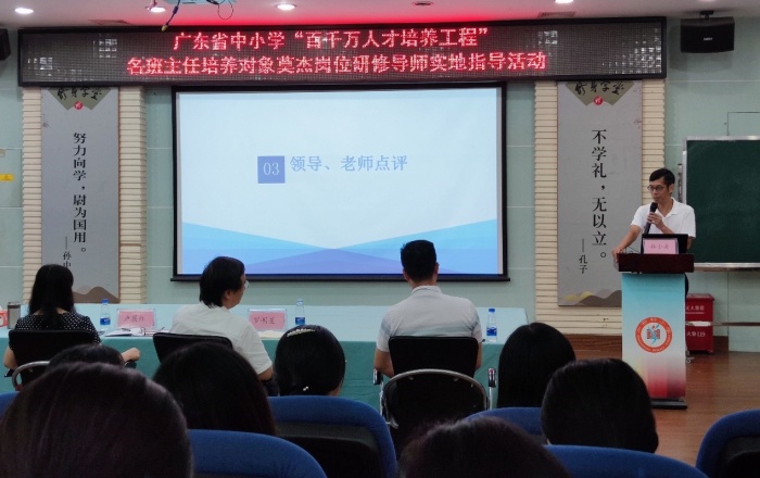接着,黄文灿副校长汇报了学校在促进教师专业发展、提升班主任队伍建设的具体做法,通过搭建“专家引领带发展、师徒结对同成长、理论修养学习、教学实践交流、教育教学研究、阅读推动、外出交流学习、各项赛课、特色班集体的建设”等多种平台,引领班主任实现“青年教师——新秀教师——骨干教师——名师”的梯度成长,全方位助推青年教师专业成长以及整个教师队伍尤其是班主任的专业发展。