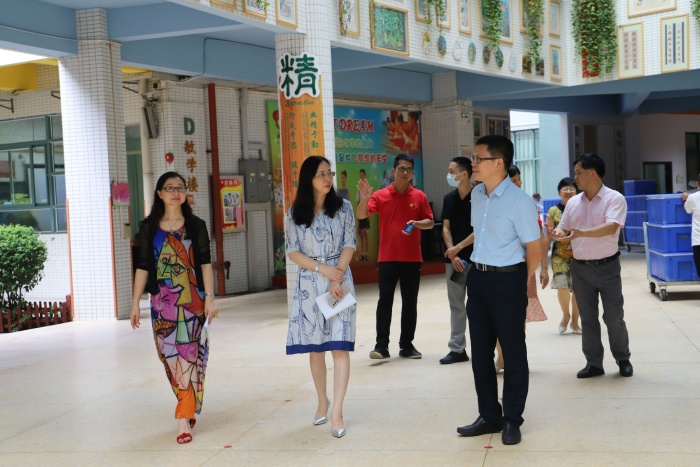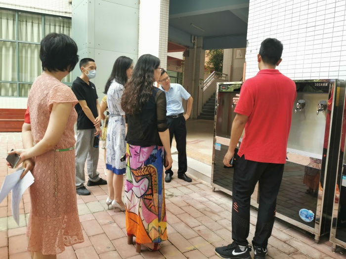 许岚、熊海敏、卢展红一行查看了校园环境布置,重点就新学期学生上学情况、老师人员就位情况、特殊个案生的关注以及学生心理健康、学校食品安全等方面进行了解。在走访过程中,大家看到校园新进的饮水设备,便进一步就学生饮水健康安全、食品安全问题进行询问。其中,许岚主任特地问及了疫情期间饭堂送餐操作流程,并就食品安全问题、从货源进货、材料保存与加工、食品制作流程、饭堂人员健康等方面,事无巨细逐一询问,确保师生安全无虞。
