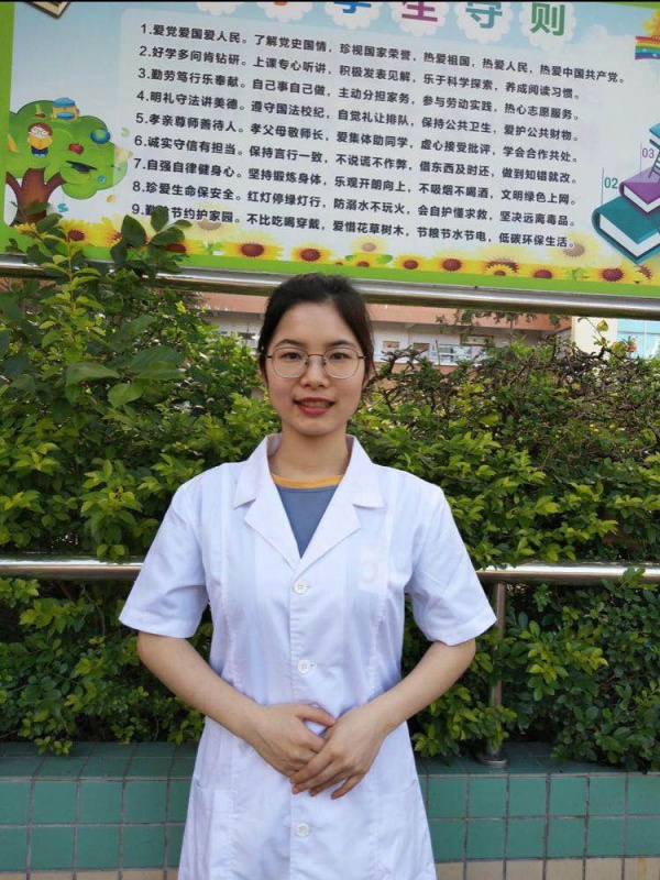 陈婷婷老师既是学校的校医,也是卫生教师,每天面对着活泼可爱的小学生,她的日常工作是帮助他们学习、了解、掌握有关预防疾病、合理膳食、合理用药等维护健康的知识与技能,增强自我主动健康意识,不断提高健康管理能力。看着孩子们的成长,陈婷婷老师觉得很有成就感,很享受这份工作。