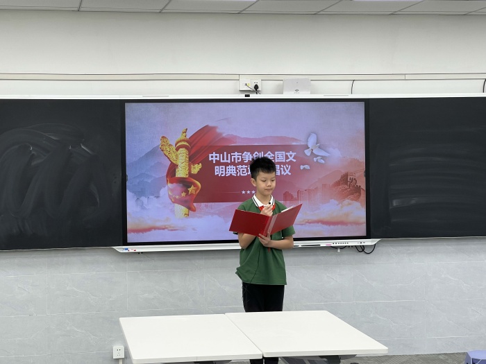 首先,大队委宣读《争创全国文明典范城市倡议书》。倡议全校同学:主动参与,争做文明创建的传播者;身体力行,争做文明创建的实践者;冲锋在前,争做文明创建的先锋队。