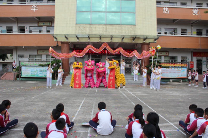 礼花齐放,锣鼓争鸣,腾龙翻舞,雄狮助威,同学们热血沸腾。