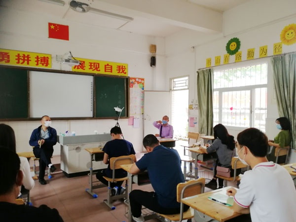 德育主任戴勇波要求老师们要随时关注学生的心理健康,做好心理疏导,每天做好消毒及记录,强调含氯消毒液的正确使用,做到每天测量体温三次,班主任做好晨检和午检记录,强调午餐注意事项及操作流程,提醒师生做好健康卡电子签名和上交粤康绿码;提醒门口值日老师正确使用测温枪,测温枪不能与学生皮肤接触,所有流程要严格按照之前的演练流程进行操作。