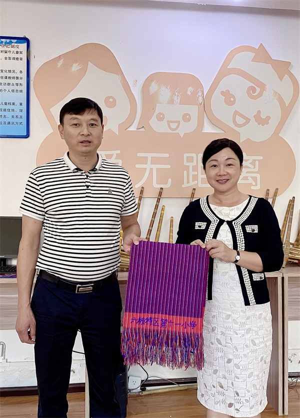 29日上午,学校的大课间活动,第十一小600多名学生们展示代表办学特色、具有民族风情的竹筒舞,展示了独特的贵州民族文化,学生们的表演十分精彩。接着是到学校手工室的参观活动。邓海校长亲自展示织布机的使用方法,最后还送给雍景园小学织好的绣有“六枝特区第十一小学”字样的手工成品留作纪念。