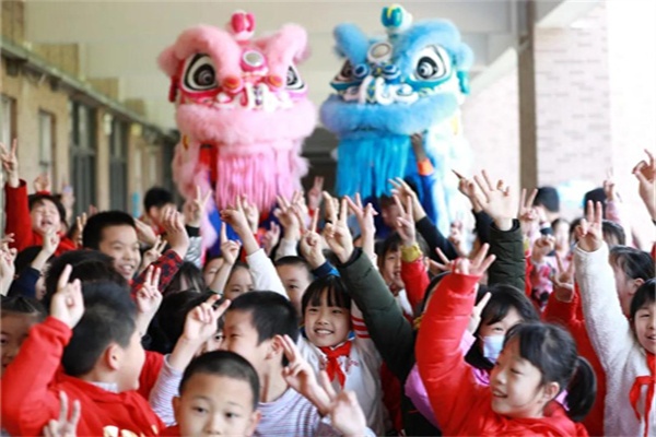 校门口,校长和老师们身穿喜庆服装,微笑着迎接孩子们的回来。小浪花们从老师们手中接过美好祝福的虎年徽章,开心地进入校园。校园内,迎接他们的是精神抖擞的醒狮快闪。随着锣鼓擂响,舞狮款款走来,双头醒狮口吐祥瑞对联,为远洋师生送上“龙腾虎跃”“身体健康”等新春祝福。