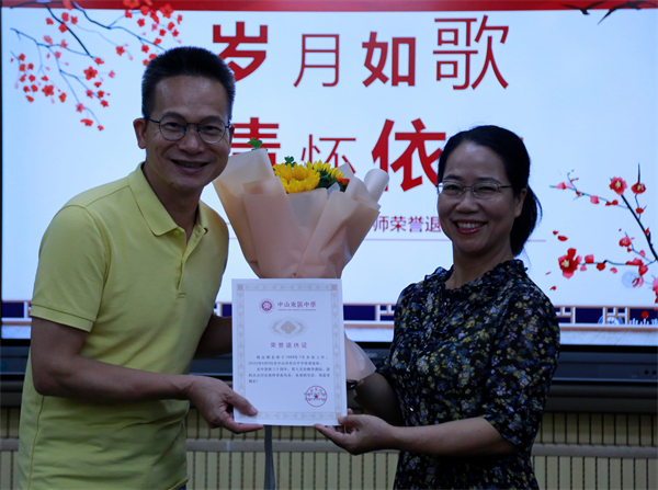 然后,谢柏芳校长代表学校向杨金娥老师颁发了荣誉退休证书,对杨老师在东区中学取得的成绩给予了充分肯定,对杨老师为学校作出的贡献表示衷心感谢,并祝愿杨老师退休生活更精彩。