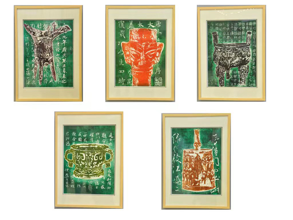 施恒老师结合古代不同年代青铜器与不同书法体作为创作题材,以5幅不同题材画作为系列作品,通过古代时间轴排序,用木刻版画方式进行艺术创作,在选送中的多幅版画作品中脱颖而出并展览。