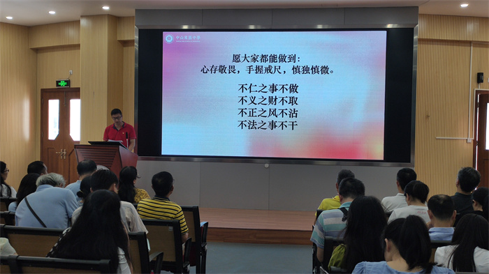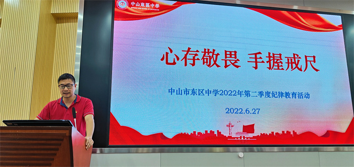 为持续加强学校党风廉政建设,筑牢广大党员干部和教职工拒腐防变的思想道德防线,6月27日下午,中山市东区中学举行主题为“心存敬畏 手握戒尺”的2022年第二季度纪律教育学习月活动。活动由校党总支委员杨群同志主持,全体教职工参与学习。