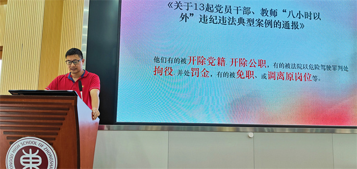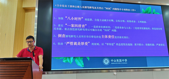 会上,蔡昌盛同志带领全体教职工学习了《关于在全市开展党员干部和公职人员酒驾醉驾及其背后“四风”问题专项整治的工作方案》。同时,对个别党员干部、教师“八小时以外”违纪违法典型案例的通报进行了再学习,为全体教职工明确了纠“四风”和酒驾醉驾重点工作及相关要求。要求全体教职员工提高思想认知,端正工作态度,坚决杜绝顶风违纪行为,进一步积极营造风清气正的工作氛围。同时,对全体教职工提出倡议,希望大家提高思想觉悟,守住生活警戒线,带头遵守法律法规、党纪党规、社会公德。自觉主动减少应酬,把时间和精力用在干事创业和陪伴家人上,树立公私分明、尚简戒奢、文明健康的新风正气。