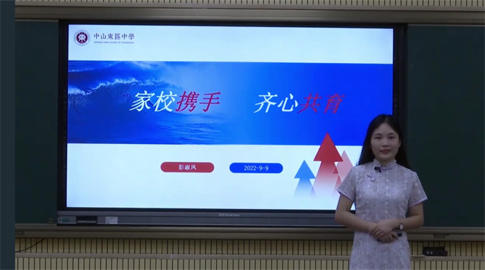 第二项议程由高一年级的彭淑凤主任作题为《家校携手 齐心共育》的分享。首先,彭主任向各位家长对中山市东区中学进行了详细的介绍,窗小能留月、檐低不碍云,小而精致的东中校园环境幽雅、人文气息浓厚;多样特色课程的开设、满足了学生个性化发展的需求,师资队伍业务水平高、教学成果突出显著;彭主任强调,老师和家长像是两支船桨,只有双方朝着同一个方向共同努力,孩子才能朝着期望的方向驶去;为加强家校协作、形成教育合力,她对家长们提出了四点希望:第一、亲其师信其道,相信、敬爱并尊重认真为学生付出的老师;第二、巧用钉钉、实现有效交流、增强互动;第三、配合学校的管理,坚持原则;第四、做好陪伴、智慧点拨,了解状况、心中有法,做好后勤、松弛有度,主动学习、以身示范。