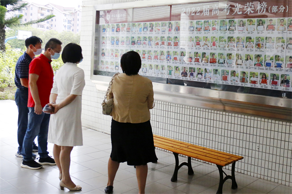 走到折桂路上,冯副主席指出,桂花树下的条木椅和四墩上刻着的诗词这一设计非常好,让同学们在休憩的闲暇,也可以有意无意地欣赏中国古诗词,浸润中国优秀传统文化。当听到谢柏芳校长介绍折桂路的来历,以及谢校长会在折桂路上为优秀的同学拍照纪念的时候,冯副主席更加肯定学校这种非常用心用情做教育的做法和情怀。