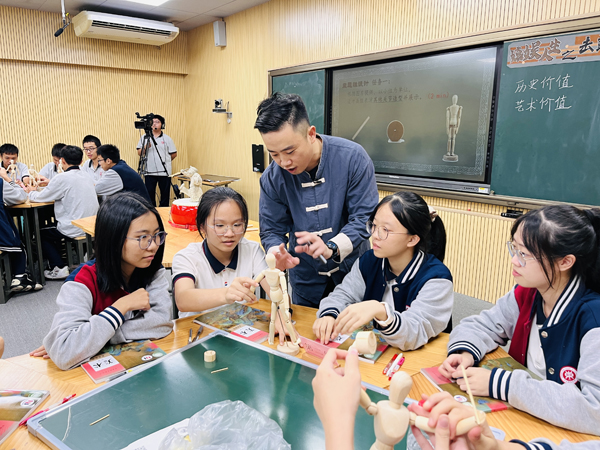 “咚…咚咚…咚咚咚”,施恒老师以鼓奏乐,以家乡闽南非遗文化说唱片段导入课堂,并运用多元式对话场景开展教学活动,通过“魔法”技术的设疑,引导学生跟随线索识别击鼓说唱俑独特的面部特征,通过人偶关节定点的摆动,学生化身工匠人,感受不同姿态动作带来的传神趣味体验。课堂的最后,施恒老师以说明介绍文字标签为导引,牵引学生用精简的文字了解不同姿态的说唱俑形象并准确识别摆放说唱俑正确位置,通过本节课,让学生感受汉代说唱艺人的乐天与自由。