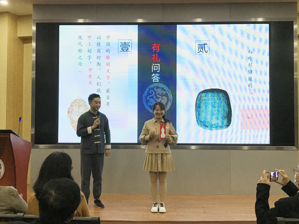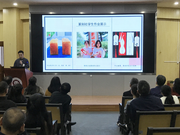 本次校本培训由我校中华优秀传统文化中心教研组施恒老师主讲,培训主题为篆刻艺术专题《方寸之间精雕细琢》。讲座分四个主要内容,分别为篆刻的起源、应用、推广以及最后的互动。施老师通过2008年北京奥运会”中国印”和2022年北京冬奥会“会跳舞”的运动图标导入培训主题,详细解读并现场示范了如何熟练运用篆刻的形式、篆法与刀法,他通过结合我校特有的篆刻校园文化,分享了我校近五年的篆刻文化毕业衫掠影,为大家带来了一场生动有趣、内涵丰富、实用性强的文化大餐,同时也展示了我校两位同学在省教厅印迹中国比赛中分别取得省二、三等奖并代表广东省参加教育部国赛的参赛作品。讲座的最后,施恒老师和全校老师们进行了更为深入的互动问答,也将学生们亲手制作的许愿牌及书签赠与了现场老师。