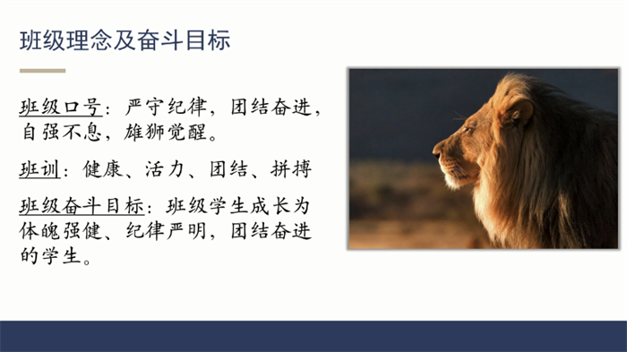 高三7班雄狮班,狮子是一种群居动物,它们分工细致,各司其职,同时又团结一致,共同完成各种大事。希望班级学生能像雄狮一样勇敢坚强,团结协作,拥有强健的体魄和钢铁般的意志。班级口号:严守纪律,团结奋进,自强不息,雄狮觉醒。以班级学生成长为体魄强健、纪律严明,团结奋进的学生为班级奋斗目标。