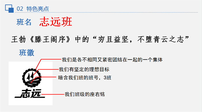高三3班志远班,取自唐代著名文人王勃《滕王阁序》中的“穷且益坚,不堕青云之志”之意。班级的特色概括为“激发学生内驱动力,培养学生自主成长能力”,在贯彻立德树人的育人理念中坚持以人为本,尊重班集体中的每一个个体,通过班级文化建设和管理制度营造良好的班风学风,以“三班人,三班魂,三班争当人上人”为口号,激发学生的内驱动力,通过典型同学的激励,以“所谓成功,就是在平凡中做出不平凡的坚持”这句话作为价值引领,希望同学们在将来的发展中能够明确自己的目标并且坚定而执着地努力着,培养学生的坚韧品格和自主成长能力。