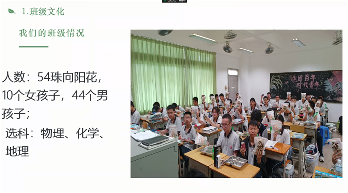 本次活动共有4位班主任参加评选,由林丽娜副校长、德育处符晓主任、蔡昌盛主任,团委程超书记以及班主任梁可盈老师、钟检秀老师担任评委,全体班主任参与投票。参赛的班主任们录制精美的班级介绍视频进行展示,评委们观看视频进行评选打分。