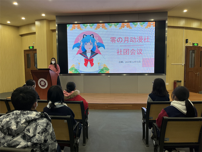 为顺利推进元旦晚会节目的排练工作,引导社团活动走向课程化建设,2022年12月16日,中山市东区中学零の月动漫社于学校报告厅召开社团指导会议暨“日语教学讲堂”系列活动课程。此次会议由社团指导教师梁可盈、张赛珍老师主持,动漫社全体成员参与。