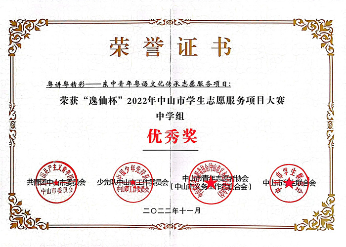 2022年11月,“粤讲粤精彩”——东中青年粤语文化传承志愿服务项目成功入围2022年“逸仙杯”中山市学生志愿服务项目大赛的决赛,并获评优秀奖。