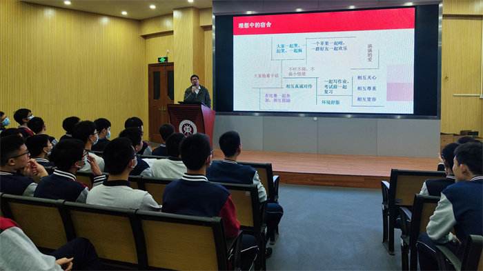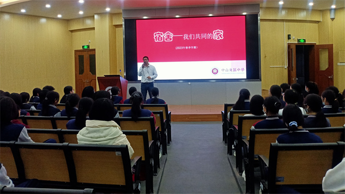 为了加强学校宿舍管理,提升住宿生的自我管理和自我约束能力,营造良好的学习和生活环境,2023年2月5日晚上,中山市东区中学于报告厅召开本学期宿生会议,本次会议由德育处蔡昌盛主任主持,分男女生两场,宿管老师和住宿生参加。