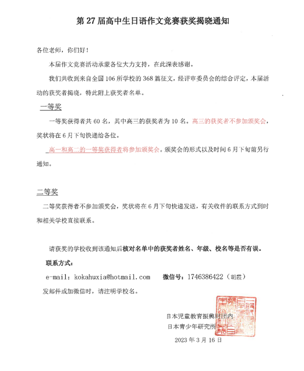 全国高中生日语作文竞赛由中日两国青少年研究中心主办,每届比赛都有全国20多个省市开设日语课程的上百所中学积极组织参加,参赛学校和人数众多,竞赛影响力大,已成为国内高中生日语比赛的顶级赛事之一。